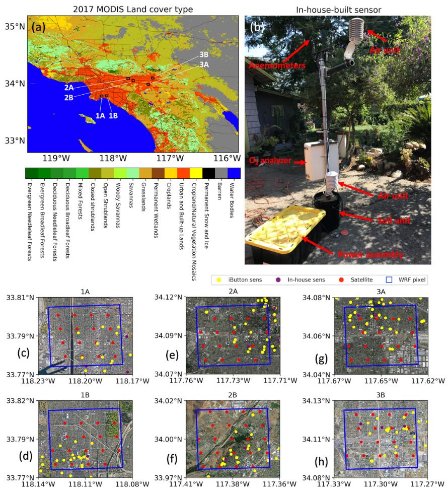 我們設計了我們的研究,以評估2017 年夏季從單個地塊到洛杉磯大都市區(圖 1a )的多個尺度的溫度和 O 3變化。我們圍繞單個社區組織了傳感器部署,我們將其定義為 4 × 4 km 2樣方. 密集的現場部署集中在加利福尼亞州長灘和內陸帝國的各個部分(圖 1c-1h),這是洛杉磯大都市地區的一個子集,嚴重未達到 O 3. 部署持續時間分為三個活動。在 2017 年 6 月至 7 月的第一次活動中,六個傳感器節點被分布到長灘附近距離小于 20 公里的兩個樣方(每個樣方三個傳感器節點)(例如,圖 1中的樣方 1A 和 1B) . 通過這種設計,樣方大小可與空氣質量模型和 EPA 排放清單的標稱空間分辨率相媲美,后者通常為 4 × 4 km 2,而兩個樣方之間的距離可與 TROPOMI 足跡的尺寸相媲美( 4 × 7 公里2) 在最低點。因此,社區科學網絡的分布非常適合進行測量,以解決有關亞網格尺度模型不確定性和亞像素分辨率衛星檢索不確定性的問題。2017 年 7 月至 8 月的第二次活動和 2017 年 8 月至 9 月的第三次活動的部署與第一階段的部署類似,但針對克萊蒙特(圖 1中的 2A 和 2B )和圣貝納迪諾(3A)附近的不同樣方和3B),分別。當兩個樣方在項目的每個階段配對以測量子區域梯度預期溫度和 O 3時,項目所有三個階段中的鄰域對都被選擇以共同反映區域梯度。